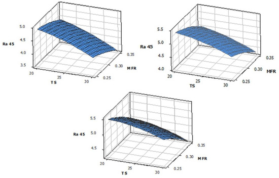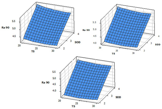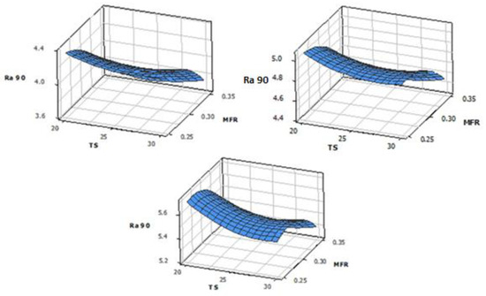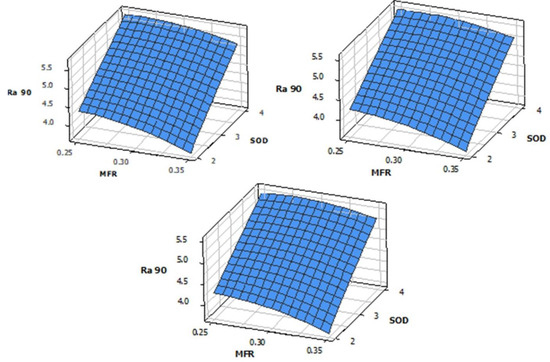 Figure 12, Figure 13 and Figure 14 illustrate the surface plot for the specimen with 90° fiber inclination. It appears that variations in TS do not have a significant impact on surface roughness. However, changes in the parameter SOD result in a significant deviation in the graph, indicating a high level of influence. The best combination for this specimen is TS = 25 mm/mim, SOD = 2 mm and MFR = 0.35 mm/min.