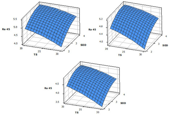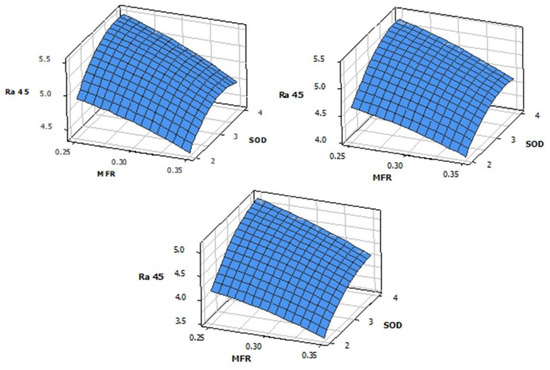 Figure 9, Figure 10 and Figure 11 represent the surface plots for the composite when the fiber inclination is 45° with various combinations of input parameters and levels. From the figures, it is clear that changes in TS, SOD and MFR have a significant influence on surface roughness. A change in TS does not have much influence on surface roughness, unlike the abrasive MFR which has a huge influence. The lowest value of delamination was obtained for the combination TS = 30 mm/min, SOD = 2 mm and MFR = 0.35 kg/min.