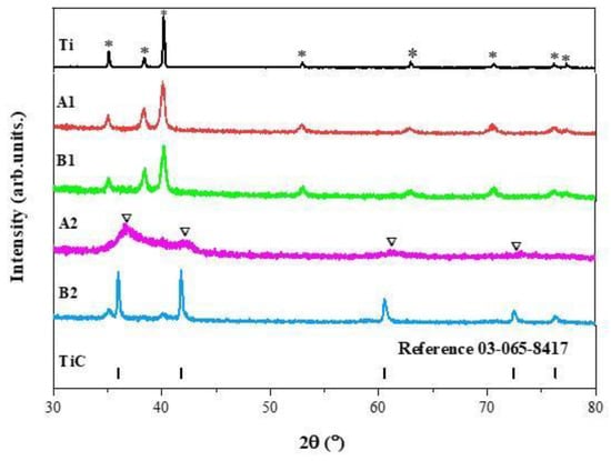 Indexing of X-ray diffraction patterns for samples obtained from milling for 4 h. Samples A1 and B1 demonstrate the formation of Ti (asterisks), whereas sample B2 is predominantly TiC with the presence of Ti. The sample labeled as A2 was indexed considering four peaks (triangles) related to TiC.