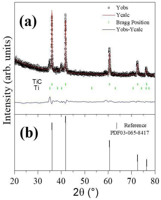 To determine the parameters of the unit cell in the sample where TiC was predominantly obtained, the refinement of the diffraction patterns was carried out using the Rietveld method implemented using profile fitting FullProf Suite software []. Figure 2a presents a comparison between the experimental diffraction pattern (black line with symbols, Yobs) and the calculated diffraction pattern (continuous red line, Ycalc). This figure also depicted the residual line (continuous black line, Yobs-Ycalc) and Bragg positions for TiC and Ti, respectively.