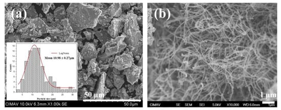 Figure 3a,b shows the SEM features related to the morphology (size, shape, and distribution) of the initial materials (corresponding to the Ti and CNT particles). Additionally, an inset in panel a shows a count of 200 particles to determine the average particle size of the Ti particles. The counting was conducted using the Image J program version 1.50i []. The histogram was analyzed employing a log-normal fit using the iterative Levenberg–Marquardt method implemented in the Origin program version 2018 [].
