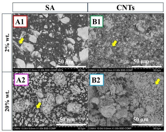 Figure 4 shows the comparison between the SEM images to monitor the effect of two carbon sources on the size and distribution of the particles used in the formation of TiC. The SEM micrographs for the samples A1 and B1 are depicted at the top of the panel, which contain 2% wt of the carbon sources (SA and CNTs). This micrograph shows that the flake-type shape with a narrow particle distribution predominates (see the yellow arrows). This type of morphology occurs during the AM process between a ductile material (Ti) and a brittle one C. This is due to the multiple fractures and cold welding of the materials, which are caused by the collisions of the mill balls, resulting in a reduction of the size of the particles. The effect of stearic acid in sample A1 is similar to the NTCs. They acted as a lubricant when adhered to the surface of the metal (Ti) and inhibited the cold welding of the particles.