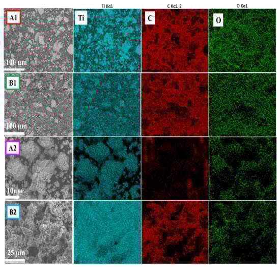 Comparison between SEM-EDS map of element distribution (titanium, oxygen, and carbon) in the alloy powders TiC. (A1,A2) samples are prepared with SA, while (B1,B2) are obtained with CNTs.
