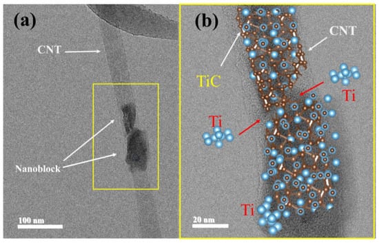 HR-TEM micrographs of CNT with TiC. (a) Nanoblock of TiC developed in a CNT, and (b) schematic visualization of the formation mechanism of in situ TiC around a CNT using VESTA software, version 3.