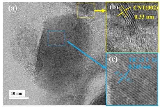 Continuing with the microstructural analysis of the TiC nanoparticles, Figure 7a presents a representative HR-TEM micrograph. In this micrograph, two highlighted regions can be observed. The first region marked in blue shows two polygonal-shaped particles merging to form a lump-like structure [], corresponding to TiC. In the second region marked in yellow, an elongated microstructure corresponding to the CNTs can be observed. Figure 7b provides a magnification of a CNT section, indexed using Digital Micrograph software, version 3.6.1 [] and the identification card, ICSD 00-041-1487. Indexing associates an interplanar distance of 0.34 nm with the (0 0 2) plane. Figure 7c shows a section within the polygonal particle, where a distance of 0.245 nm corresponding to the (1 1 1) plane of TiC was obtained, with the identification card, ICSD 03-065-8417. Dislocations and folded zones resulting from milling, indicating a plastically deformed structure, can also be observed within the image. It is worth noting the indexed regions in the high-resolution images exhibit crystallinity that persists after the 4 h milling process.