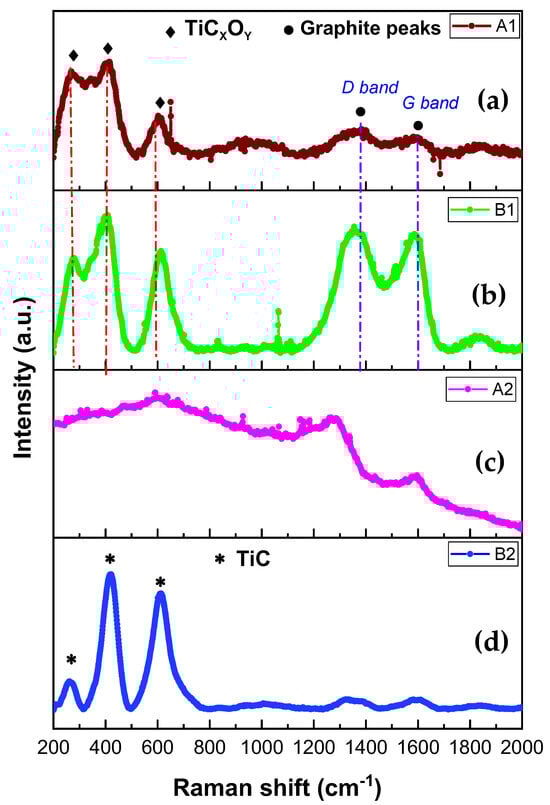 Raman spectra of Ti and C powders milled. Panels (a,c) are related to A1 and A2 samples prepared with SA. Panels (b,d) exhibit the profile for B1 and B2 samples prepared with CNTs. The label TiCxOy is associated with titanium oxycarbide (diamonds dash-dot line), and TiC is titanium carbide (asterisks). Graphite peaks are denoted as D and G bands (circles and violet dash–dot line).