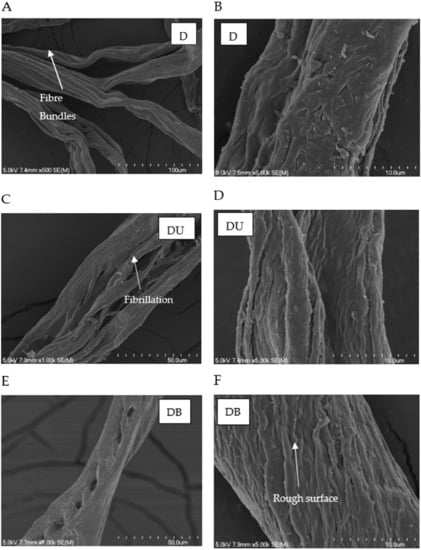 Figure 1E,F shows the fibre surface of the digested and bleached fibres. The fibres in the images are seen to have a more textured surface than the digested fibre. This surface is likely a result of the removal of localised lignin and extractives from the fibre surfaces during the bleaching process, exposing the microfibrils in the fibre. This theory agrees with the literature, where a rougher surface was obtained from hydrogen peroxide bleaching, where it was subsequently used to improve interfacial strength in the corresponding composites [13]. Hydrogen peroxide bleaching is also known to remove lignin content [25]. The images also imply that more fibre separation has occurred, and more individual fibres are present (compared to the digested fibre). The potential increase in fibre separation is likely the result of the removal of lignin and extractives, which naturally hold the fibres together in fibre bundles.