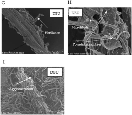 SEM of (A,B)—digested fibre (D), (C,D)—digested and ultrasonic-treated fibre (DU), (E,F)—digested and bleached fibre (DB), and (G–I)—digested bleached and ultrasonic-treated fibre (DBU).