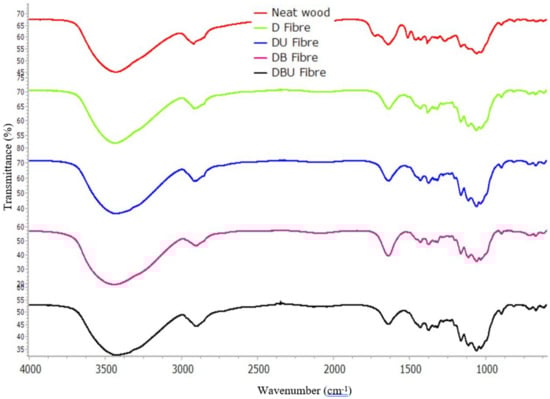 FTIR results from neat wood and all fibre samples. Neat wood (wood flour), D (digested fibre), DU (digested and ultrasonic-treated fibre), DB (digested and bleached fibre), and DBU (digested, bleached, and ultrasonic-treated fibre).