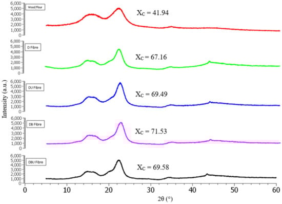 X-ray diffraction (XRD) was used to analyse the crystallinity of the timber and fibres. The crystallinity index of the wood flour and fibres gives further insight into the constituents in the timber, and the XRD spectra provides insight into any potential changes to the crystalline cellulose. The crystallinity index was calculated using the Segal method using the spectra in Figure 3. The resulting crystallinity indices (Xc) are displayed in Figure 3 along with the spectra. The results show that the crystallinity index increases with progressing chemical processing. The crystallinity index increased from 41.9% for the timber, to 67.2% for the digested fibres (comparing F and D samples). Furthermore, the crystallinity index increased to 71.5% because of the bleaching process (comparing D and DB samples). The increase in the crystallinity index was likely due to the removal of amorphous material, including lignin, hemicellulose, and other extractives. This reduction in amorphous constituents is confirmed by the SEM, fibre quality analysis, and FTIR discussed earlier.