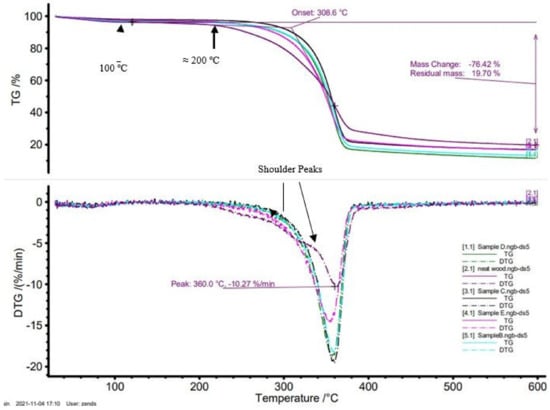 TGA was used to analyse the thermal degradation of the treated timber and fibres. Figure 4 shows the TG and DTG (1st derivative of TG) analysis for all fibres and wood flour samples and Table 2 summarises the mass change, onset temperature, and peak degradation temperatures. The DTG results show the first derivative of the TG results, providing peaks that represent the rate of thermal degradation. Variances in the TG and DTG for the fibre samples are likely due to differences in the content of cellulose, lignin, hemicellulose, and extractives. Previous studies suggest that “hemicellulose decomposes at a lower temperature range (220–315 °C) than cellulose (300–400 °C), while lignin decomposes over a broad range of temperatures (150–900 °C)” [32]. However, it has been reported that the heavy metals can affect the thermal conductivity of the material, potentially affecting the thermal degradation properties [10].