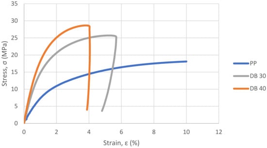 Stress–strain curve of PP 30 wt% DB fibre (DB 30) and 40 wt% DB fibre (DB 40) composites.