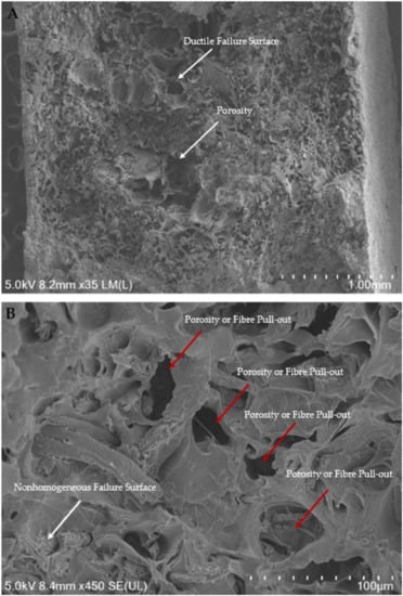 The failure surfaces of the composites were studied using SEM to understand the failure mechanisms during tensile testing. Overall, the composites showed minimal differences between the composites produced with varying fibre treatments. Figure 6 shows some examples of failure surfaces of the composites. The long matrix ‘tongues’ shown in the figures indicate that the composites fail in a ductile manner caused by plastic deformation of the matrix of the same magnitude (if not bigger) of the fibres within the composite. The composites also indicate a non-homogenous failure surface in all composites, which could potentially suggest poor mixing during the extrusion or poor compatibility with the fibres and matrix resulting in a non-homogenous mix of fibres and polymer through the composites cross-section. The figure also indicates some porosity within the composites. This could further lead to reduced composite strength, as it acts as stress concentrations in the material while testing. Overall, the SEM indicates that the composite performance could be improved with improved processing.