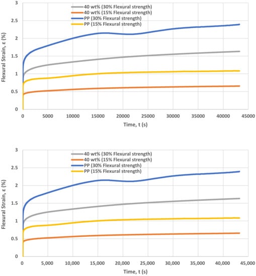 Creep testing was undertaken over a 12 h period to understand the influence of the introduction of fibres to PP on the viscoelastic behaviour. The 40 wt.% DB fibre composites were used for the study since they showed the most appropriate mechanical properties for the construction sector. PP was used as a comparison. The composite and PP were tested at 15 and 30% of their specific flexural strength. The PP flexural strength was 23.56 MPa, and the DB composites flexural strength was 45.19 MPa. The resultant flexural strain was measured over a 12 h period and shown in Figure 7.