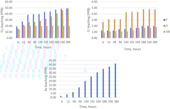 Figure 8 shows the cumulative leaching of copper, chromium, and arsenic from 30 wt.% wood flour (F), digested fibre (D), and digested and bleached fibre (DB) composites over a 14-day period (cumulative leaching values after 14 days are summarised in Table 5). The experimentation took place by measuring only one sample of leachate per composite material at each time interval, and the accuracy of the results could be increased through testing replicates. Furthermore, although the results of all of the testing were above the quantitative limit of the ICP–MS experimentation, some of the results indicate extremely low levels of heavy metals (especially the leaching of As from D and DB fibre composites), and the results of samples with very low levels of leaching are potentially susceptible to errors in the methods undertaken or contamination. However, the results shown in the figures give a clear trend in leaching properties between samples.