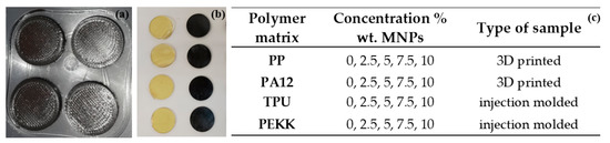 The nanocomposite specimens of each composition, prepared either through 3D printing or by injection molding, were subjected to induction-heating testing. In Figure 3a, the 3D-printed specimens of PP nanocomposites are presented, while, in Figure 2b, the injection-molded specimens of PEKK are depicted, before the induction-heating testing. Moreover, a summary of all nanocomposite specimens that were prepared for testing are presented in the table included in Figure 2c.