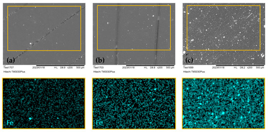 SEM micrographs of the surface of 3D-printed PA12/Fe3O4 nanocomposite samples and Fe filler distributions, as determined by elemental mapping (EDS): (a) 2.5 wt.%, (b) 5 wt.%, (c) 10 wt.% Fe3O4.
