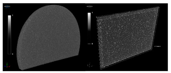 Moreover, before the induction-heating testing, a selected nanocomposite specimen of PEKK/Fe3O4 (10 wt.% MNPs) was subjected to micro-CT analysis. Using micro-CT analysis, features of the microscale can be observed as the resolution is approx. 10 μm, while features in the nanoscale cannot be distinguished. The particles are homogeneously dispersed in the polymeric matrix. The microscale features that are observed in Figure 5 correspond to the agglomerates of MNPs.