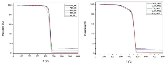 Thermogravimetric analysis was carried out with a NETZSCH/ STA 449 F5 Jupiter thermal analysis system. The instrument is accompanied with a desktop computer for the analysis of the data using the related software. The system consists of a silicon carbide furnace with a range from 25 °C to 1550 °C, a SiC heating element, and an Al2O3 protective tube for gas flow with a stop valve. The high-quality SiC heating element of the furnace allows a maximum operation temperature of 1550 °C. The present thermal analysis was conducted from 50 °C to 800 °C by applying a heating step of 10 °C/min in inert N2 atmosphere (nitrogen flow: 50 mL/min), to receive information about degradation and stability of the received polymers. Specifically, PA12 and PP were tested for their thermal stability, since they were the two nanocomposites that were 3D-printed for specimens’ preparation.