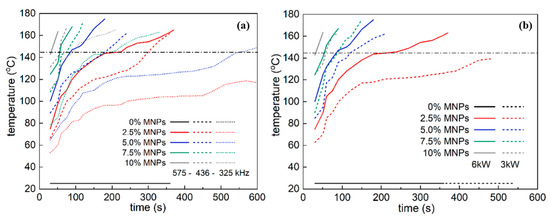 To investigate the effect of the induction heating system’s operating parameters on the heating capacity of the TP nanocomposites, an extensive study varying the frequency and input power was conducted on the PP nanocomposites. Τhe heating capacity of the samples exposed to RF fields at 575, 436, and 325 kHz frequencies, at the maximum achieved power for each frequency, is presented in Figure 7a, as a function of the exposure time. For a frequency of 575 kHz, the maximum achieved power of the RF field was 6 kW, while for a frequency of 325 kHz, it was 4 kW. Exposing PP samples to the RF field, a temperature increase was observed, which was proportional to the content of the MNPs. By increasing the mass ratio of the MNPs in the nanocomposites, a higher increase in temperature was observed [28,29,30]. A higher heating capacity was observed for the samples exposed to the RF field with a higher frequency, when compared to the behavior of the PP samples with the same MNPs’ concentration that were exposed to fields of different frequencies. Specifically, the samples exposed to the RF field with a 575 kHz frequency reached the melting temperature (Tm) of PP faster, compared to the samples exposed to the RF field with frequencies of 436 and 325 kHz. The PP samples exposed to a lower frequency RF field required a longer exposure time to increase their temperature and reach Tm. An RF field with a high frequency is more suitable for the inductive particle heating of compounds than RF fields with lower frequencies [28,30].