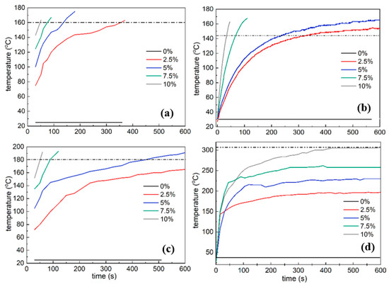 Heating capacity (temperature rise) of MNPs’ nanocomposites: (a) PP, (b) PA12, (c) TPU, and (d) PEKK, as a function of exposure time in RF field of 575 kHz and 6 kW. Dashed lines indicate the Tm of each matrix.
