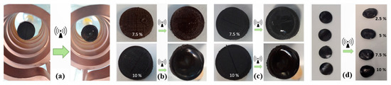 (a) Sample in the coil; nanocomposites before and after induction heating: (b) PP, (c) PA12, and (d) PEKK.