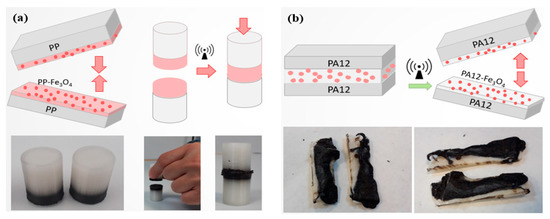 The concept of a bonding and debonding mechanism was investigated in “sandwich” structures with PP and PA12 nanocomposites. The schematic concept and images of the two 3D printed components of pure PP, including a part of PP with MNPs, are presented in Figure 10a. Bonding of the two PP components in one part was achieved after 1 min of exposure to RF field, simply by manually applying pressure. Additionally, debonding was demonstrated in a PA12 “sandwich” rectangular structure, which consisted of two pure PA12 components connected with a PA12 part with MNPs (Figure 10b). Exposing the PA12 “sandwich” structure to the RF field at the optimum operating conditions for less than 3 min, the nanocomposite PA12 part with the MNPs melted, and the two components of the pure PA12 were debonded, by manually applying force. Several studies reported the potential use of induction heating for the bonding/debonding of TP composite structures compared to the traditional joining methods, even though this technology has not significantly shifted to industrial applications [33,34].