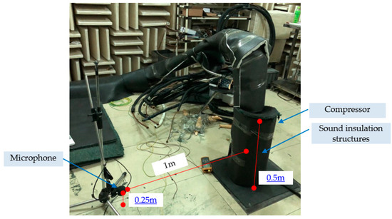 Figure 2 shows the sound insulation test method for a sound insulation structure. The displacement of the compressor is 60 cm3/rev, the height is 0.5 m, and the test microphone is placed 1 m away from the compressor and 0.25 m above the ground. To eliminate the influence of the connecting pipe on the compressor noise test, the connecting pipe is wrapped with a three-layer sound insulation structure to ensure that the noise of the microphone test is transmitted from the compressor body, as shown in Figure 2.