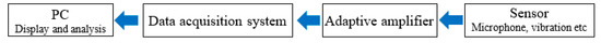 The principle of noise acquisition is shown in Figure 3. The front end uses a BK microphone sensor to collect the signal, which is modulated by an adaptive amplifier. The signal is then converted into an analog electrical signal, which is processed by the data acquisition system. Finally, the signal is converted into a digital electrical signal and analyzed by the computer.