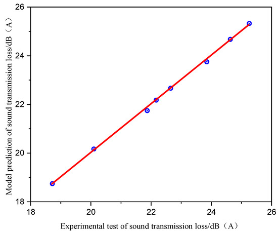 The straight line represents the best straight fit of the experimental and regression model data. The blue points represent a pair of an experimental data point and the results of the regression model for that specific point. If the point falls on the straight line, it means that the predicted value is equal to the experimental value. If the point deviates a lot from the straight line, it means that the predicted value is significantly different from the experimental value. As illustrated in Figure 4, the predicted value is in good agreement with the experimental value. For more combination schemes of polyvinyl chloride and non-woven fiber with different thicknesses, the predicted value can be calculated according to the fast calculation model proposed in this paper. The mathematical model for the rapid calculation of the sound transmission loss of double-layer sound insulation structures can guide the rapid design of sound insulation structure combinations.