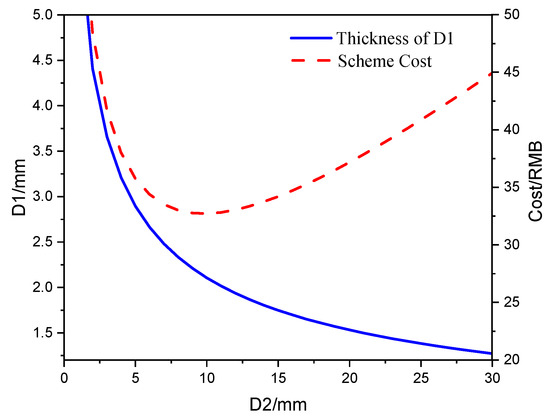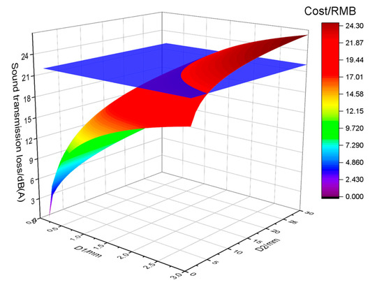 A numerical calculation program based on Python is compiled to calculate the combination of parameters that meet the conditions in Figure 6. As shown by the solid blue line in Figure 7, with the increase in D1 (polyvinyl chloride’s thickness), D2 (non-woven fiber’s thickness) decreases, which indicates that the sound transmission loss used by both the non-woven fiber and polyvinyl chloride materials is consistent with the actual physical meaning. In Figure 8, the red dotted line indicates the cost under the corresponding combination scheme of non-woven fiber and polyvinyl chloride’s thickness. With the increase in D1 (polyvinyl chloride’s thickness) and the decrease in D2 (non-woven fiber’s thickness), the total cost of the scheme first decreases and then increases, and there is a minimum. The corresponding thickness of non-woven fiber and polyvinyl chloride is the most cost-effective combination.
