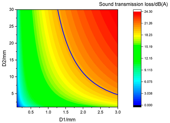 From Figure 7, we can see more clearly that the sound transmission loss expressed by the blue solid line is 22 dB (A), and the parameter combination located in the upper right area of the blue solid line represents that the sound transmission loss is greater than 22 dB (A). According to the engineering requirements, we can continue to draw on several areas to facilitate the rapid search for engineering applications.