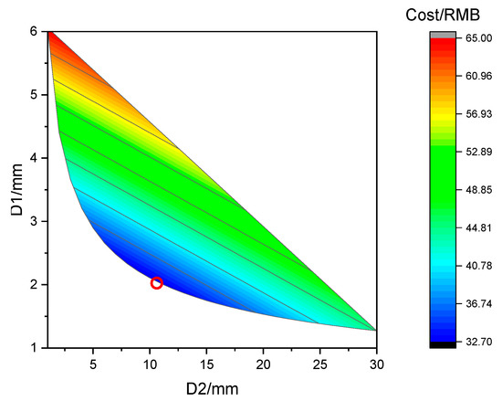 As shown in Figure 9, there are many parameters that meet the sound transmission loss of 22 dB. The solid lines in the Figure 9 correspond to different costs, respectively, and the lowest cost is located at the bottom red circle. According to the optimization purpose of the lowest cost in this paper, the detailed parameters can be obtained, as shown in Table 4.