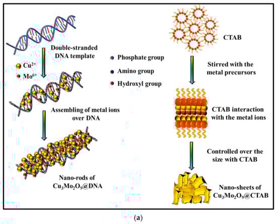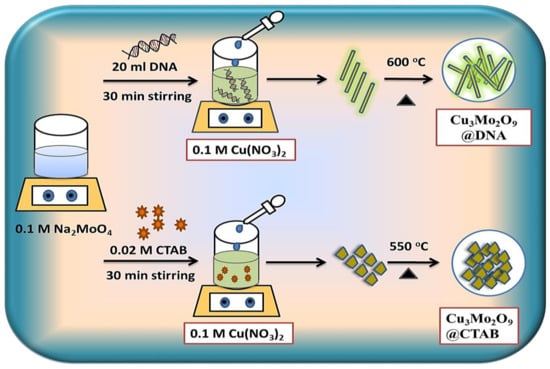 The synthesis of Cu3Mo2O9@DNA and Cu3Mo2O9@CTAB was carried out by coprecipitation followed by an annealing method using two different structure-directing agents, i.e., CTAB and DNA. The synthesis is represented schematically in Figure 1.