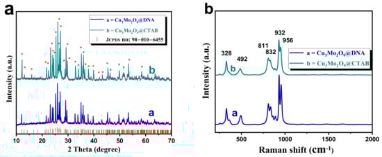(a) Stacked XRD (diffraction peaks marked with red asterisks (*)) of both Cu3Mo2O9@DNA and Cu3Mo2O9@CTAB; (b) Raman analysis of both Cu3Mo2O9@DNA and Cu3Mo2O9@CTAB.