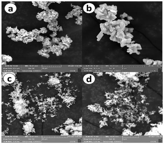 In order to study the morphological analysis of Cu3Mo2O9@DNA and Cu3Mo2O9@CTAB, SEM analysis was performed and is shown in Figure 3. From the low-magnification SEM images of Cu3Mo2O9@DNA (Figure 3a), a nanorod structure can be observed with a ~1.2 µm length and ~400 nm diameter. The individual nanorods of Cu3Mo2O9 are clearly visible in the SEM images under high magnification (Figure 3b). However, in the SEM images of Cu3Mo2O9@CTAB under low as well as high magnification (Figure 3c,d), perfect nanosheets between 150–200 nm in thickness are observed.