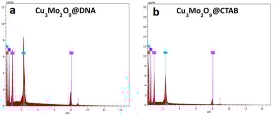 The elemental presence in both samples was confirmed with EDS analysis obtained from the separated detector used in the SEM instrument (Figure 4a,b). For both samples, elements such as Cu, O, and Mo were present. Additionally, the presence of carbon, which is obtained from the DNA and CTAB used to synthesize the samples, was observed. More precisely, for both the EDS spectra, the extra peaks for any impurities were not identified, suggesting the pure form of the Cu3Mo2O9 samples.
