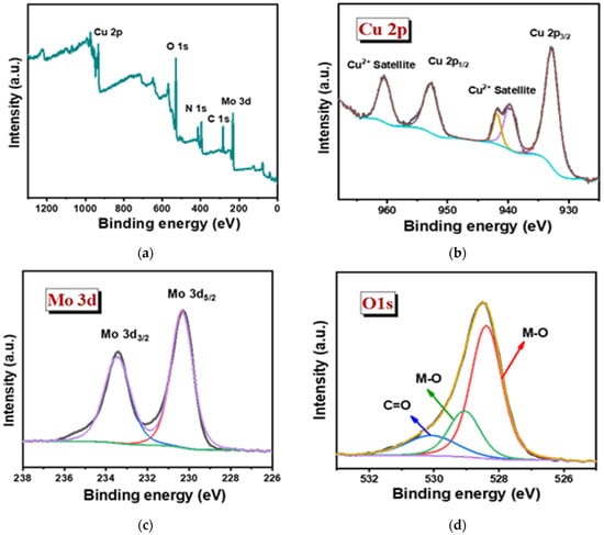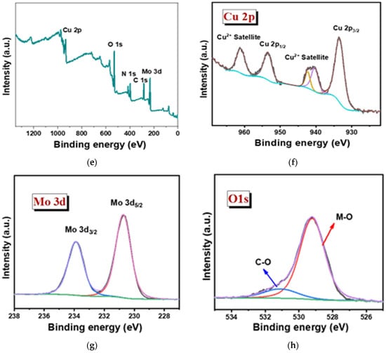 The oxidation state of the sample was studied in detail via XPS for both the Cu3Mo2O9@DNA and Cu3Mo2O9@CTAB samples (Figure 5). The elemental presence, such as Cu 2p, Mo 3d, O 1s, N1s, and C1s peaks, with their corresponding binding energy values, was noted in both samples, showing the formation of Cu3Mo2O9 from DNA and CTAB, respectively (Figure 5a,e) []. In the high-resolution XPS spectra of Cu 2p, the presence of Cu 2p1/2 and 2p3/2 formed during the spin-orbital splitting, with binding energy values such as 932.9 and 960.5 eV, corresponding to the presence of Cu2+ in Cu3Mo2O9@DNA (Figure 5b). In addition, the presence of satellite peaks was noted with the binding energies 939.7, 941.83, and 960.43 eV for Cu2+. Similarly, in the high-resolution spectra of Cu 2p for Cu3Mo2O9@CTAB, the presence of Cu2+ was noted with their corresponding satellite peak in Figure 5f. The XPS spectra of Mo 3d show the splitting of Mo 3d3/2 and 3d5/2 with binding energy values of 233.46 and 230.32 eV, indicating the presence of Mo6+ in Cu3Mo2O9 (Figure 5c,g). In addition, the high-resolution spectra of the O1s spectra of both Cu3Mo2O9 samples showed two peaks at 528.37 and 529.07 eV, corresponding to the M-O bonds. The presence of the C=O peak at 530.1 eV comes from the DNA used for the material synthesis (Figure 5d). Similarly, the presence of the M-O peak and the C-O were noted for the Cu3Mo2O9 developed using CTAB (Figure 5h). Thus, the overall observed characterization results suggest that Cu3Mo2O9 was formed over the two different structure-directing agents, DNA and CTAB.