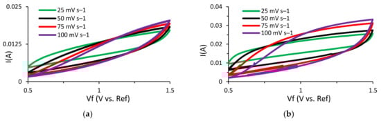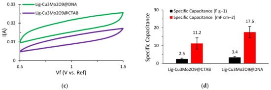In order to compare and analyze the energy storage performance of the Cu3Mo2O9 nanoparticle-decorated lignin-based asymmetric supercapacitors, electrochemical testing was performed. Initially, cyclic voltammetry (CV) tests were run to study the characteristic behavior of these supercapacitors. In this research, a NaOH electrolyte was used instead of the usually preferred KOH electrolyte. This is due to the quick deterioration of lignin that occurs when it comes into contact with KOH, which results in very poor capacitive performance and a short cycle life. The CV tests were run at multiple scan rates for both supercapacitors (Al/Lig-Cu3Mo2O9@DNA & Al/Lig-Cu3Mo2O9@CTAB) (Figure 6a,b). A paper separator coated with NaOH as the electrolyte was used. The operating voltage range for both supercapacitors was maintained at 0.5–1.5 V. For higher scan rates, the rate of diffusion increased while the specific capacitance decreased. For slow irreversible chemical reactions, the thickness of the diffusion layer is proportional to the applied potential and decreases at higher applied potentials. As a result, with higher scan speeds, delayed irreversible processes are preferred, resulting in high currents. This eliminates the side reaction peaks and the associated noise from the system, producing a smoother CV curve []. This results in a quasi-rectangular form and can be attributed to diffusion restrictions that prevent efficient contact between the electrolyte and the electro-active material []. Additionally, a film of impurities is formed on the electrode surface during the charge–discharge process, resulting in a positive reduction current []. Hence, a scan rate of 25 mV s−1 was adopted for additional CV testing. CV plots for Al/Lig-Cu3Mo2O9@CTAB and Al/Lig-Cu3Mo2O9@DNA are displayed in Figure 6c. A histogram comparing the measured specific capacitance values for the two supercapacitors can be seen in Figure 6d. The maximum specific capacitance value measured for Al/Lig-Cu3Mo2O9@CTAB is 2.5 F g−1 (11.2 mF cm−2) and for Al/Lig-Cu3Mo2O9@DNA is 3.4 F g−1 (17.6 mF cm−2). In comparison to the Al/Lig-Cu3Mo2O9@CTAB supercapacitor, the Al/Lig-Cu3Mo2O9@DNA supercapacitor exhibited a greater specific capacitance during the CV testing. The superior performance of the Al/Lig-Cu3Mo2O9@DNA supercapacitor can be attributed to the different structure-directing agents used to fabricate the Cu3Mo2O9 nanoparticles. Due to the varying formation mechanisms of CTAB and DNA, different Cu3Mo2O9 nanostructures with varying degrees of agglomerations were obtained. The associated formation and charge-storage mechanisms are explored in the next section.
