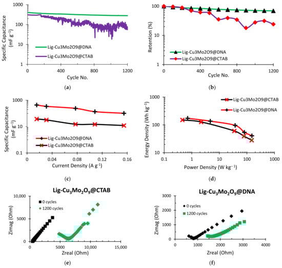 The supercapacitor’s cycle life and system stability are its two most important criteria. A cyclic charge–discharge (CCD) test was conducted for a total of 1200 cycles in order to examine the capacitance storage capability of the supercapacitors (Figure 7). The specific capacitance performance of the two materials is contrasted in Figure 7a. The initial specific capacitance for Al/Lig-Cu3Mo2O9@CTAB is 309.59 mF g−1 (theoretical capacitance = 20 mF), while the Al/Lig-Cu3Mo2O9@DNA exhibits a 404.64 mF g−1 (theoretical capacitance = 26.14 mF) initial specific capacitance. After running for 1200 cycles, the specific capacitance of Al/Lig-Cu3Mo2O9@CTAB dropped down to 74.76 mF g−1 (theoretical capacitance = 4.83 mF), and for Al/Lig-Cu3Mo2O9@DNA, dropped down to 280.6 mF g−1 (theoretical capacitance = 18.13 mF). In order to provide a proper comparative analysis of both supercapacitors, the y-axis of the cycling stability performance in Figure 7a,b was kept exponential. The capacitance energy retention for both supercapacitors is depicted in Figure 7b. Al/Lig-Cu3Mo2O9@DNA exhibits a comparatively higher retention performance of ~70%, while Al/Lig-Cu3Mo2O9@CTAB displays a retention of ~50%. In terms of cycle life and system stability, the Al/Lig-Cu3Mo2O9@DNA supercapacitor displays better capacitive performance than the Al/Lig-Cu3Mo2O9@CTAB supercapacitor. As a result, it is observed that areal-specific capacitance, as well as capacitance retention, change when the Cu3Mo2O9 nanoparticles synthesis technique is changed. This shows the extraordinary impact of the Cu3Mo2O9@DNA nanoparticles in giving the supercapacitor not only greater capacitance but also performance stability. Figure 7c shows the current density effects on the specific capacitance of both supercapacitors. The specific capacitance drops as the current density is increased from 20 to 150 mA g−1 (0.02 to 0.15 A g−1). This illustrates a supercapacitor’s general functionality. Due to the phenomenon of the regulated mass transfer of the electrolytic ions into the interior section of the electrode material, the obtained specific capacitance is high at a reduced current density [].