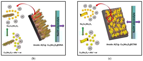 The electrochemical performance analysis shows that the DNA-mediated synthesis of Cu3Mo2O9 (404.64 mF g−1) has a higher capacitive performance than the CTAB-mediated Cu3Mo2O9 (309.59 mF g−1). In order to understand this, the charge storage mechanism in the Lig-Cu3Mo2O9@DNA anode and the Lig-Cu3Mo2O9@CTAB anode is schematically developed in Figure 8b and Figure 8c, respectively. In the NaOH electrolyte, the Na+ ions are assimilated into the Cu3Mo2O9 redox reactions [,]. While charging, the Faradaic reaction results in NaxCu3Mo2O9 formation on the surface of the anode. During the discharge process, the reaction occurs backward, and NaxCu3Mo2O9 is formed on the surface of the cathode. However, the exact storage mechanism of copper molybdates is still not clear and requires further investigation []. The better capacitive performance of Al/Lig-Cu3Mo2O9@DNA can be attributed to (i) the interaction of the positively charged metal ions (Cu2+ and Mo6+) occurring electrostatically with the negative moieties of DNA, which result in efficiently confined, self-assembled nanorods over the double-helical structure of DNA. Thus, reducing the degree of agglomeration during synthesis, which provides more accessible active sites for the electrolyte [], subsequently improving the electrochemical kinetics of the nanorods when compared to the agglomerated nanosheets. (ii) The nanorod structure facilitates rapid electron collection pathways and serves as ion storage for rapid ionic diffusion, thereby boosting the use of active materials [].
