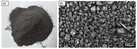 (A) Commercially available epoxy-based thermosetting PPP powder (B) SEM of epoxy-based thermoset powder blended with different resins, hardness, additives, pigments, and fillers.
