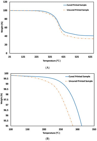 TGA determined the thermal degradation of PPP uncured and cured printed samples. The test was performed using a TGA 55 (TA instruments, New Castle, DE, USA) with a weighing accuracy of ±0.01% and temperature accuracy of ±1 °C. The data was analyzed by degradation onset temperature (DOT), defined as the temperature at which one wt% loss occurred. TGA scans were performed from 25 to 700 °C with a heating rate of 5 °C/min according to the ASTM standard E1131 []. The sample purge rate was 60 mL/min, and the balance purge rate was 40 mL/min under the Nitrogen flow of 30 psi. A sample in the weight range of 5 to 8 mg was placed in a high-temperature platinum pan, and the data was analyzed using TA Instrument’s Trios software.