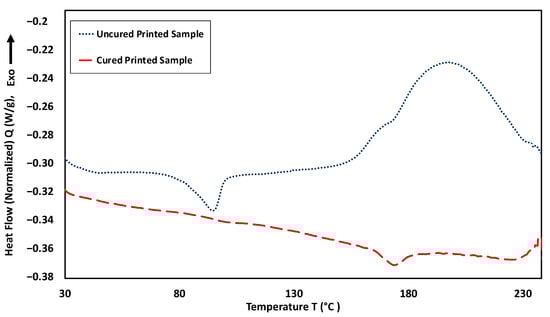 DSC analysis was carried out to prove the thermal stability of 3D printed PPP thermoset after curing. In Figure 3, uncured and cured 3D printed samples are indicated by blue and red dotted lines, respectively. The uncured model represents an endothermic peak at 94.55 °C which refers to the glass transition point (Tg). The red dotted line indicates that the fully cured sample shows an endothermic peak at 173.26 °C which denotes the melting point of thermoplastic additives added to the PPP epoxy thermoset. As the chemical crosslinking in the epoxy thermoset advanced with the curing process, thermal stability also improved after fully curing the 3D-printed PPP samples. This phenomenon is verified by the exothermic peak shown by the blue dotted line. The DSC curve for the uncured sample is represented by a blue dotted line that shows an exothermic peak at 197.93 °C, and the area under the curve attributes the enthalpy required for the curing reaction. On the other hand, the red line does not show any exothermic peaks because the fully cured sample does not need any enthalpy for further molecular cross-linking. The similar nature of thermoset polymer during DSC analysis was researched previously [,].