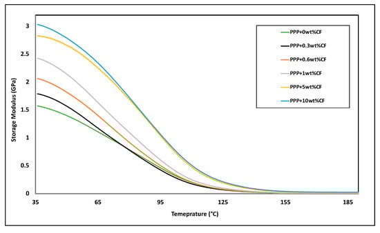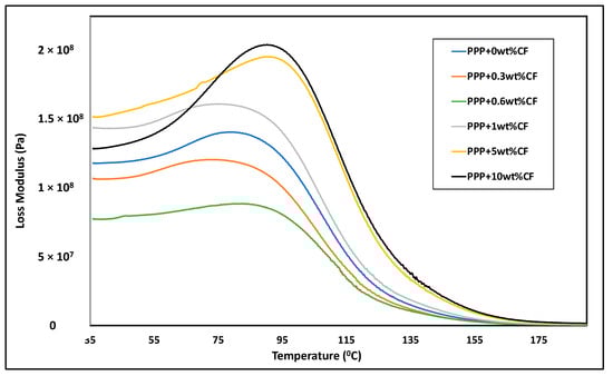 Figure 8 shows that the loss modulus of composites dropped initially as the CF concentration increased. However, it increased at a higher concentration of CF content in the PPP thermoset precisely when it was 1 wt% and more. Loss modulus denotes the material’s capacity to release energy as heat or molecular rearrangements during the deformation []. Equal or higher than 1 wt% of reinforcing fibers were incorporated into the matrix, and the flow of the polymer chains was slower. In addition, higher thermal properties, such as the conductivity of CF, increased the overall heat dissipation of the composites, resulting in a higher loss modulus. With less than 1 wt% of fiber loading, there is no overlapping of reinforcement materials. Therefore, it did not contribute to slowing down the flow resulting in a low loss modulus. Maximum heat dissipation happens when the loss modulus reaches its maximum value [,]. The loss modulus of composites decreased with rising temperature after this maximum value for all PPP/CF composites. The loss modulus reveals how viscous the polymer is, and materials usually become less viscous as the temperature rises []. At 10 wt% CF in PPP thermosets with high fiber content in PPP thermosets, the porosity was relatively higher, and the matrix material was relatively less to create viscosity at low temperatures, as shown in Section 3.6. The rising porosity was the reason of showing a lower loss modulus initially at low temperatures in fully cured 10 wt% CF/PPP samples (Figure 8).