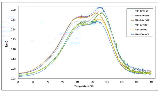 The damping factor (tanδ) is the proportion of loss modulus to storage modulus, and the impact of CF content on the damping factor is shown in Figure 9. When a polymer is heated to the glass transition temperature (Tg), the tan δ value is at its highest []. Figure 9 represents that the Tg values of CF reinforced composites did not vary while CF content increased; however, the damping factor gradually decreased with increasing wt% of CF presence. This phenomenon indicated that with higher CF content, composites’ energy absorbability was growing in terms of their ability to disperse energy, and elasticity to the viscous response of the viscoelastic material was improved during the sinusoidal deformation. A similar trend was observed in the CF-reinforced polyamide 6 composites [].