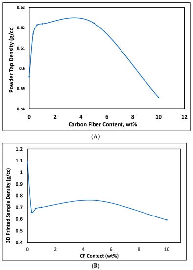 Effect of CF content in SLS-Printed fully cured thermosetting samples on (A) powder tap density (B) fully cured 3D printed sample density.
