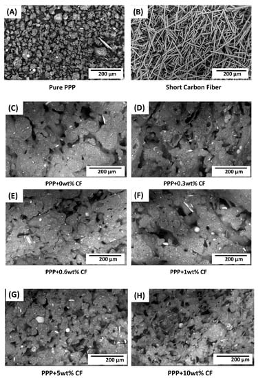 SEM analysis of (A) pure PPP, (B) short CF, and (C–H) fracture surfaces of PPP cured samples with different amounts of CF.