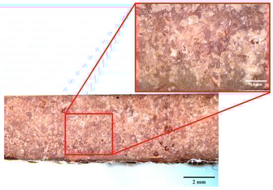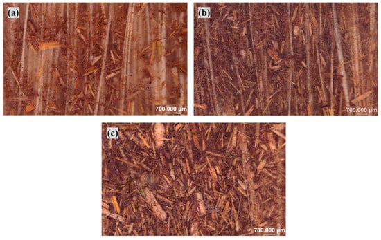 The fibers extracted from locally collected rice straw and Furcrea foetida leaves were utilized as fiber reinforcement to fabricate a polymer composite. The segregated rice straw was chopped and ground into rice straw particles (RSp). The Furcraea foetida (FF) fiber was extracted from the plant’s leaf by using the water retting process [,]. Further, the extracted FF fibers were segregated, and a unidirectional fiber mat was prepared. Epoxy (Lapox L12) and a hardener (K6) (By: Atul Pvt. Ltd., Gujrat, India) were used as the matrix material. The composite samples were prepared using the hand layup method by varying the RSp fiber concentration. Initially, the RSp and epoxy were mixed, and the hardener was added to the mixture by maintaining an epoxy–hardener ratio of 1:10. The mold was coated with a releasing agent, and a thin layer of the RSp mixture was applied. The FF mat was then placed on the previously applied RSp layer, and another layer of the RSp mixture was applied on top of the FF fiber mat. The RSp mixture was homogenously spread across the mold using a hand roller, and this step was repeated until the required thickness was achieved. The laminate was allowed to cure under room conditions for 12 h. After curing, the laminate was removed from the mold. Figure 1 shows optical microscopic images detailing the distribution of the RSp in the fabricated test samples. Table 1 details the compositions of the composites.