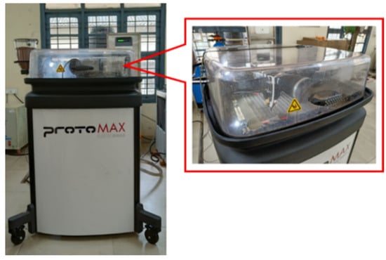 The fabricated composites are machined using an abrasive water jet machine. Figure 2 shows the AWJM (Protomax, Omax Corporation, Kent, Washington, DC, USA) used for the study. The specifications of the AWJ machine used for the study are detailed in Table 5, and Figure 3 shows the machined test samples. The garnet abrasive (85 HPX) used for the study is procured from Barton International, New York, NY, USA. The hardness of the garnet particles varies from 7.5 to 8.5 Mohs, and they are sharp and angular with an irregular shape. The abrasive consists of 92–96% of Garnet Almandine, Pyrope and Grossular with 4–8% of Magnetite, Hornblende, Feldspar, Mica and other minerals. The details of the experimental trials and corresponding responses are shown in Table 6.